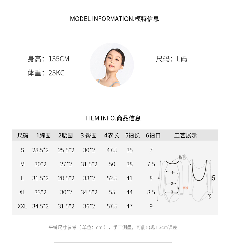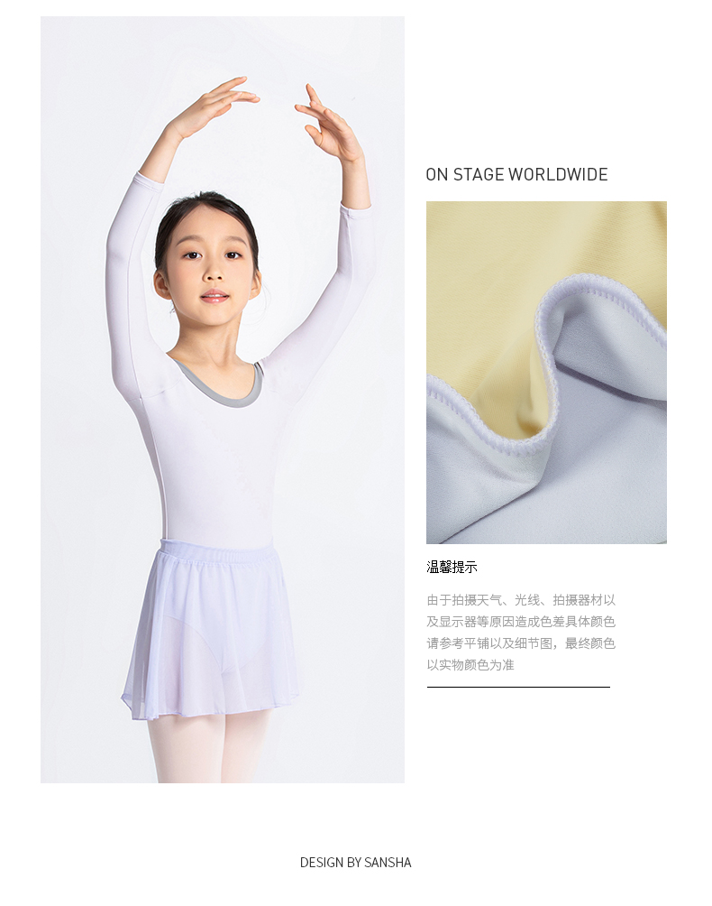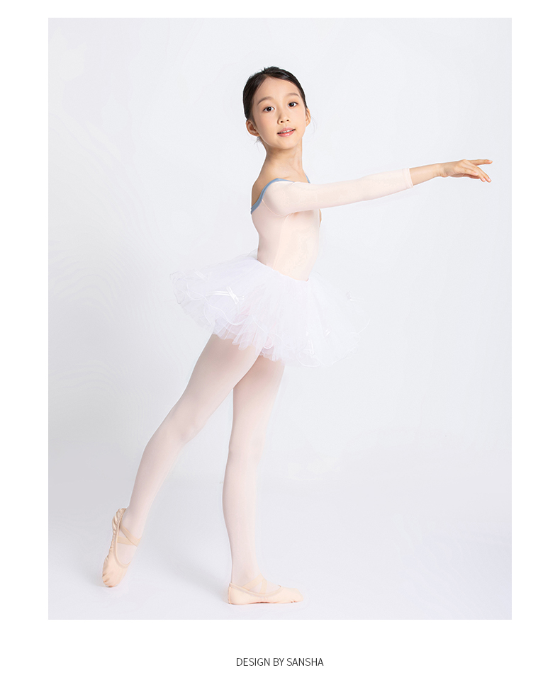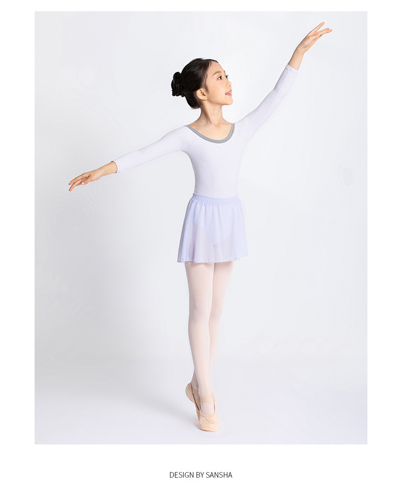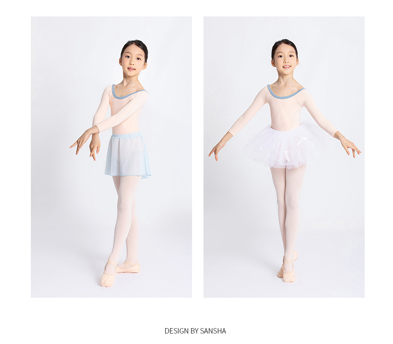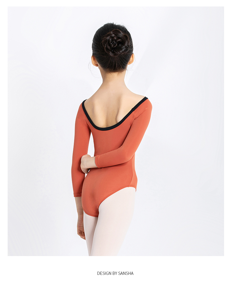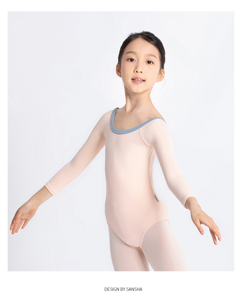 Sansha 三沙长袖舞蹈服儿童女 芭蕾舞练功服秋圆领撞色连体服演出