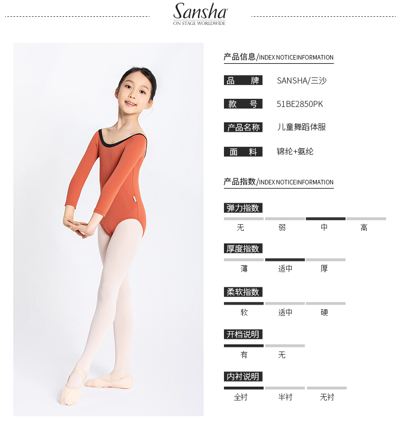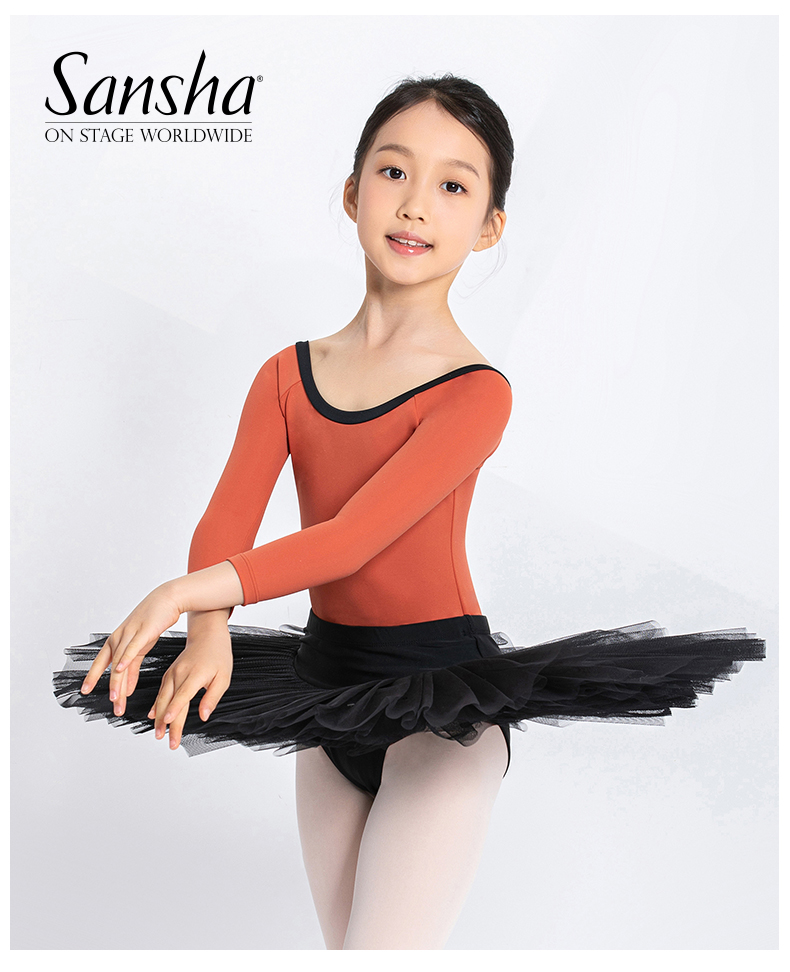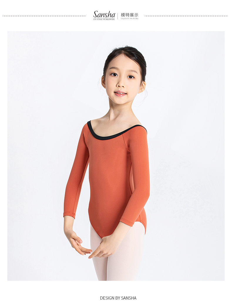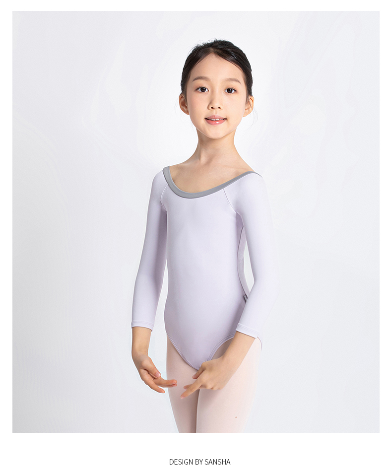 Sansha 三沙长袖舞蹈服儿童女 芭蕾舞练功服秋圆领撞色连体服演出
