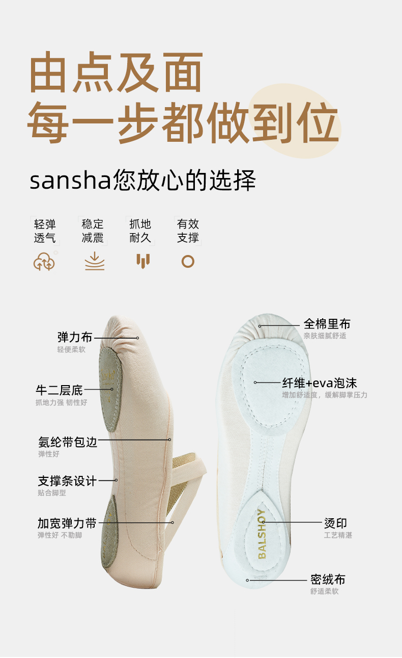 Sansha 法国三沙芭蕾舞蹈鞋女 中国舞弹力布练功软鞋猫爪鞋S495