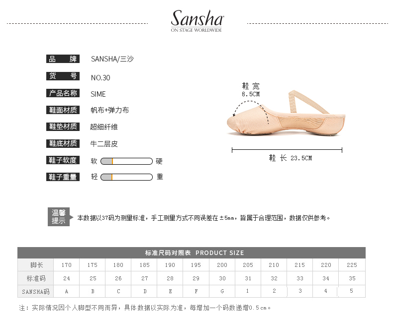 Sansha 法国三沙成人猫爪鞋芭蕾舞鞋帆布练功舞蹈鞋软鞋瑜伽鞋NO.30/Slim