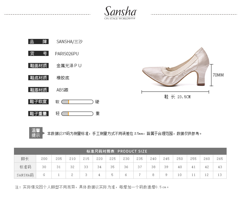 sansha 法国三沙芭蕾舞鞋 柔软PU皮室外穿舞蹈鞋 高跟街头芭蕾鞋
